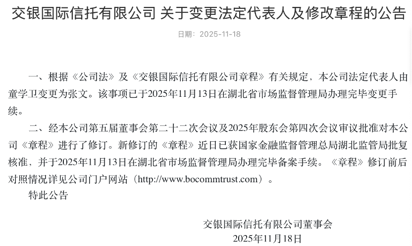 近日,交银国际信托有限公司(下称“交银信托”)发布公告表示,根据有关规定,公司法定代表人由童学卫变更为张文。该事项已于2025年11月13日在湖北省市场监督管理局办理完毕变更手续。