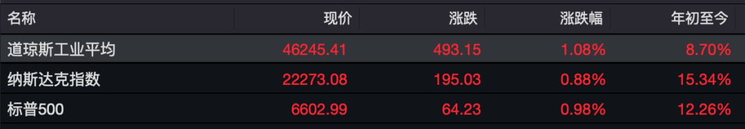 11月21日,美国三大股指全线收涨,道琼斯工业指数涨1.08%报46245.41点,标普500指数涨0.98%报6602.99点,纳斯达克指数涨0.88%报22273.08点。本周,道琼斯工业指数跌1.91%,标普500指数跌1.95%,纳斯达克指数跌2.74%。