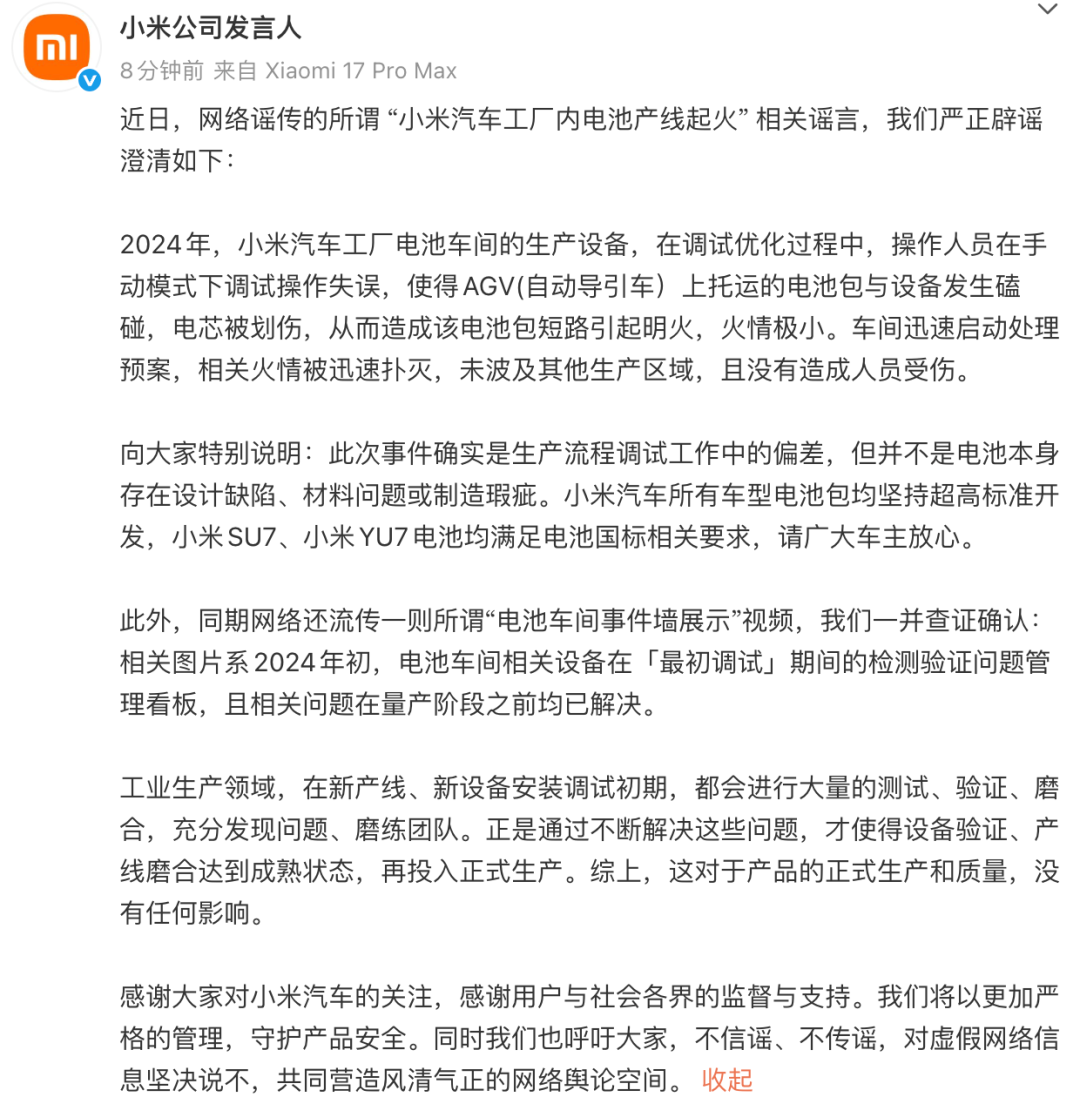 11月23日上午,“小米公司发言人”发文辟谣 “小米汽车工厂内电池产线起火” 。