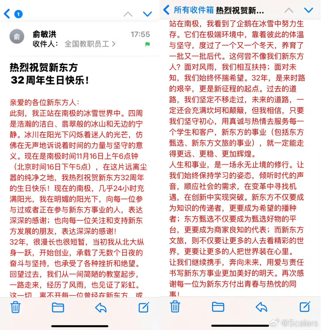 11月16日,新东方迎来成立32周年纪念日,新东方董事长俞敏洪身处南极发布内部信,向全体员工及支持者致谢。但是相关内容却引发关注,有员工表示无法与正在旅游的老板共情。