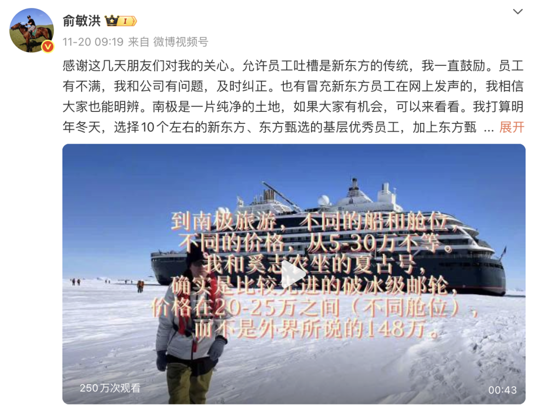 相关舆论发酵后,11月20日,俞敏洪发文回应称,自己所乘坐的邮轮舱位价格在20万元至25万元之间,并强调“南极不同邮轮和舱位价格从5万元到30万元不等”,否认花费148万元。