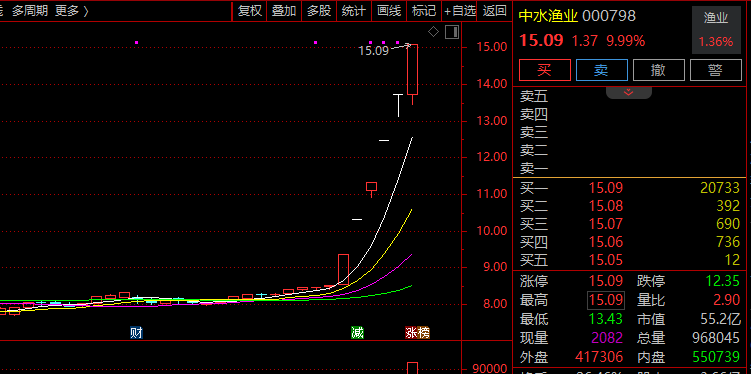 11月14日至11月21日间的六个交易日内,中水渔业股价从最低8.54元/股涨至15.09元/股,累计涨幅近77%。