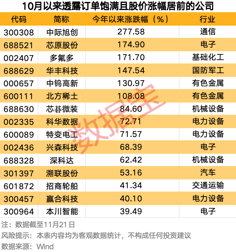 人民财讯11月24日电,据证券时报·数据宝不完全统计,10月份以来,包括中芯国际在内,有50家公司通过投资者关系互动平台、调研纪要或公司公告透露自身主营业务、产品在当年或下半年,甚至明年处于订单饱满(或订单充足、订单增长)的状态。