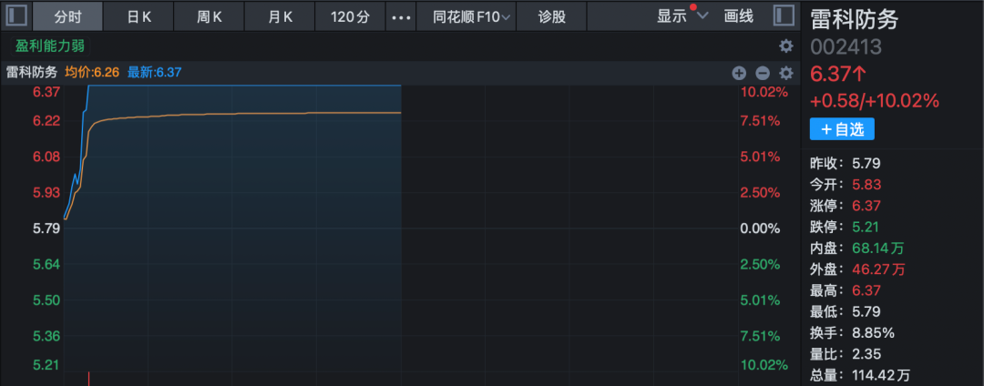 国防军工股早间全线上攻,板块指数放量高开高走。航天环宇高开后快速20%涨停,股价创2年来新高(复权,下同),开盘不到10分钟成交超前一交易日全天成交;久之洋、雷科防务、天箭科技等涨停或涨超10%。