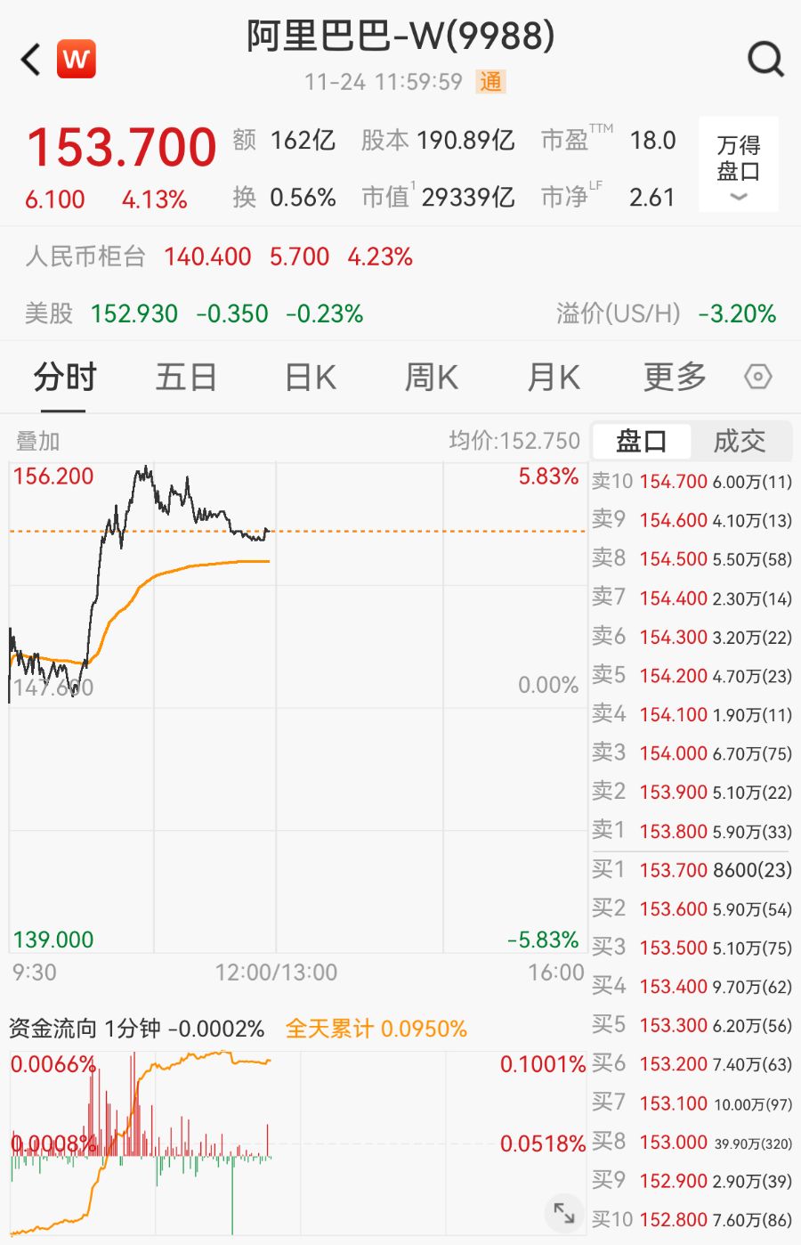11月24日上午,阿里巴巴(9988.HK)港股股价突然直线拉涨超5%,截至午间收盘,报153.70港元/股,涨4.13%,总市值为2.93万亿港元。