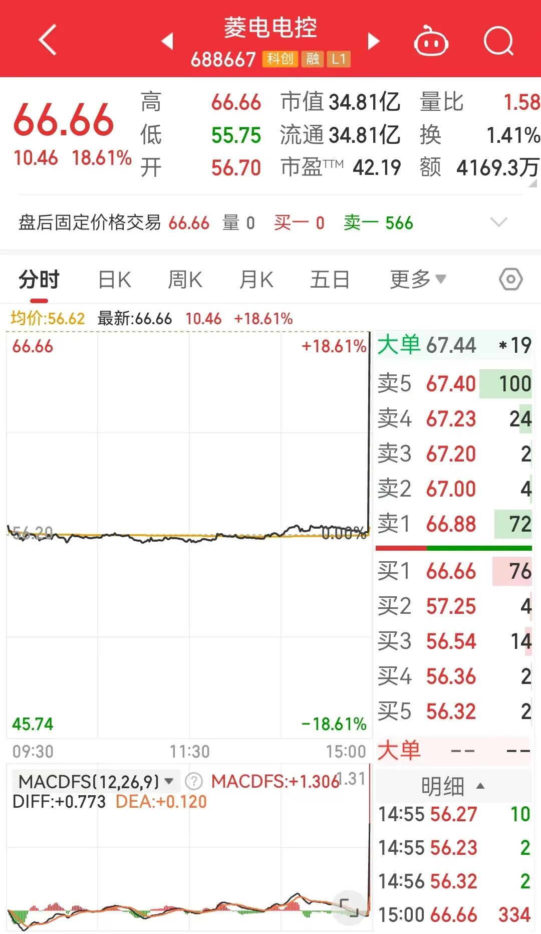 菱电电控尾盘竞价阶段股价大幅异动,涨幅由不到0.21%拉升至18.61%。短短3分钟内,股票成交量仅334手,约合资金222.6万元,A股市值增长了5.4亿元。