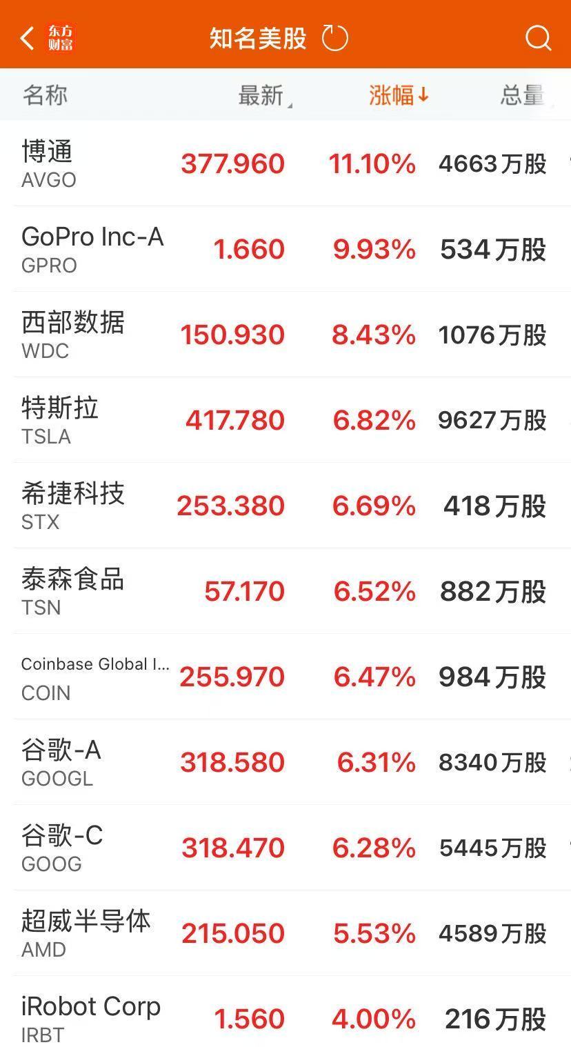 大型科技股集体上涨,特斯拉、谷歌涨超6%。