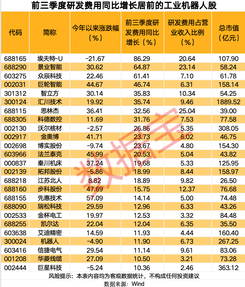从研发费用同比增幅来看,12只概念股今年前三季度研发费用同比增幅 20%以上,持续加大研发投入力度。埃夫特-U、景业智能、众辰科技同比增幅居前,分别为86.29%、64.87%、61.41%。