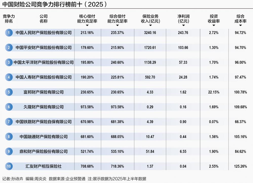 其中,中国人民财产保险股份有限公司(以下简称“人保财险”)位居榜首。2025年上半年,人保财险核心偿付能力充足率为213.16%,综合偿付能力充足率为235.37%,实现保险业务收入3240.16亿元,净利润高达243.76亿元,投资收益率2.72%,综合成本率控制在94.72%。《报告》分析认为,作为财险市场龙头,人保财险在业务规模和盈利水平上双双领先,其低于行业平均水平的综合成本率凸显了稳健的承保业务管控能力。