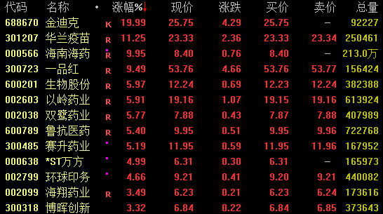 生物疫苗概念盘中发力上扬,截至收盘,金迪克20%涨停,华兰疫苗涨超10%,海南海药亦涨停,一品红涨超9%。