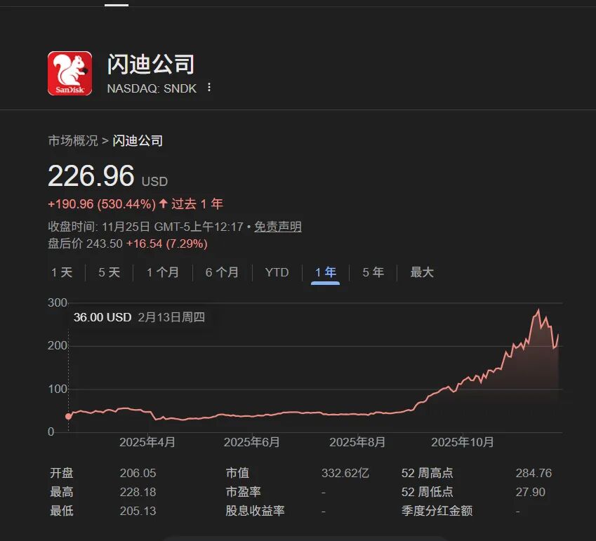 当地时间11月24日晚间,Sandisk公司确认将被纳入标普500指数。消息公布后,该公司股价上涨13.3%,盘后交易中又上涨9.4%,至248.39美元。目前,该公司市值约为330亿美元。