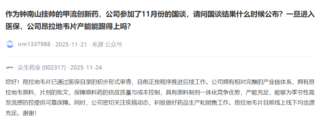 众生药业[002317]:昂拉地韦片已通过医保目录的初步形式审查,目前正按程序推进后续工作。公司拥有相对完整的产业链体系,拥有昂拉地韦原料、片剂的批文,保障原料药的供应质量与成本控制,具有原料制剂一体化竞争优势,产能充足,能够为季节性高发流感防控提供可靠保障。同时,公司密切关注疾病动态,积极做好药品生产和销售工作。昂拉地韦片目前线上线下均货源充足。