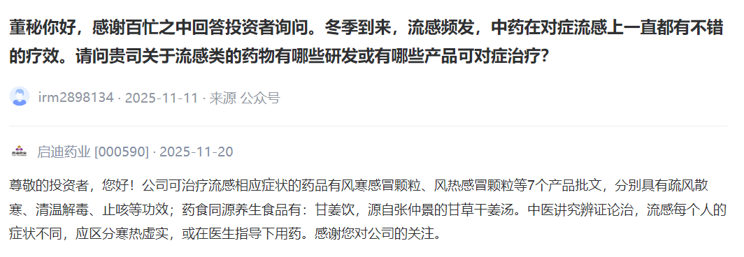 启迪药业[000590]:公司可治疗流感相应症状的药品有风寒感冒颗粒、风热感冒颗粒等7个产品批文,分别具有疏风散寒、清温解毒、止咳等功效;药食同源养生食品有:甘姜饮,源自张仲景的甘草干姜汤。中医讲究辨证论治,流感每个人的症状不同,应区分寒热虚实,或在医生指导下用药。