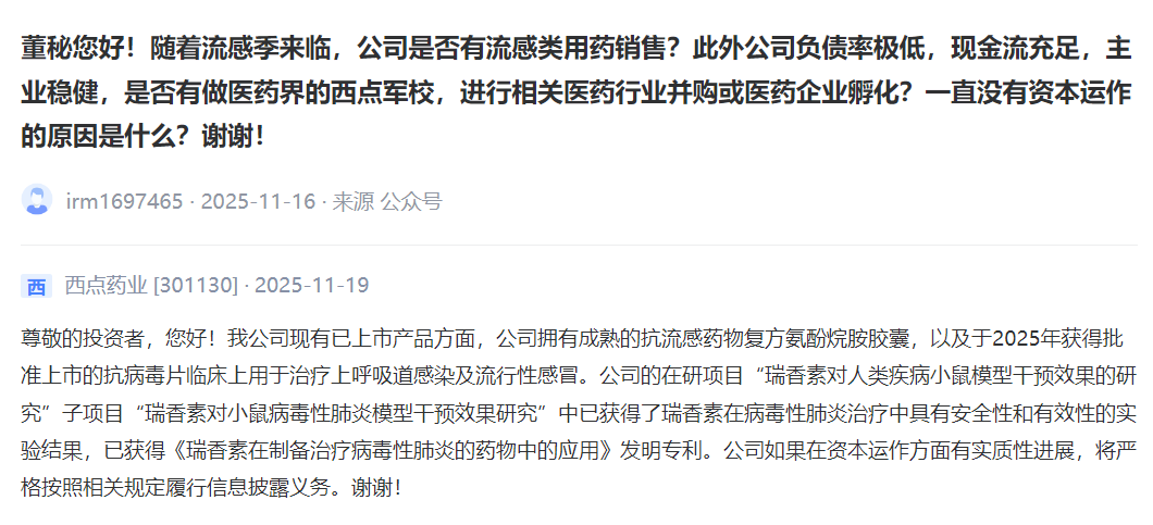 西点药业[301130]:我公司现有已上市产品方面,公司拥有成熟的抗流感药物复方氨酚烷胺胶囊,以及于2025年获得批准上市的抗病毒片临床上用于治疗上呼吸道感染及流行性感冒。公司的在研项目“瑞香素对人类疾病小鼠模型干预效果的研究”子项目“瑞香素对小鼠病毒性肺炎模型干预效果研究”中已获得了瑞香素在病毒性肺炎治疗中具有安全性和有效性的实验结果,已获得《瑞香素在制备治疗病毒性肺炎的药物中的应用》发明专利。公司如果在资本运作方面有实质性进展,将严格按照相关规定履行信息披露义务。