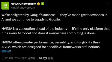 英伟达在社交平台X上发文称:“我们对谷歌的成功感到高兴——他们在人工智能方面取得了巨大进展,而我们也将继续向谷歌供货。”