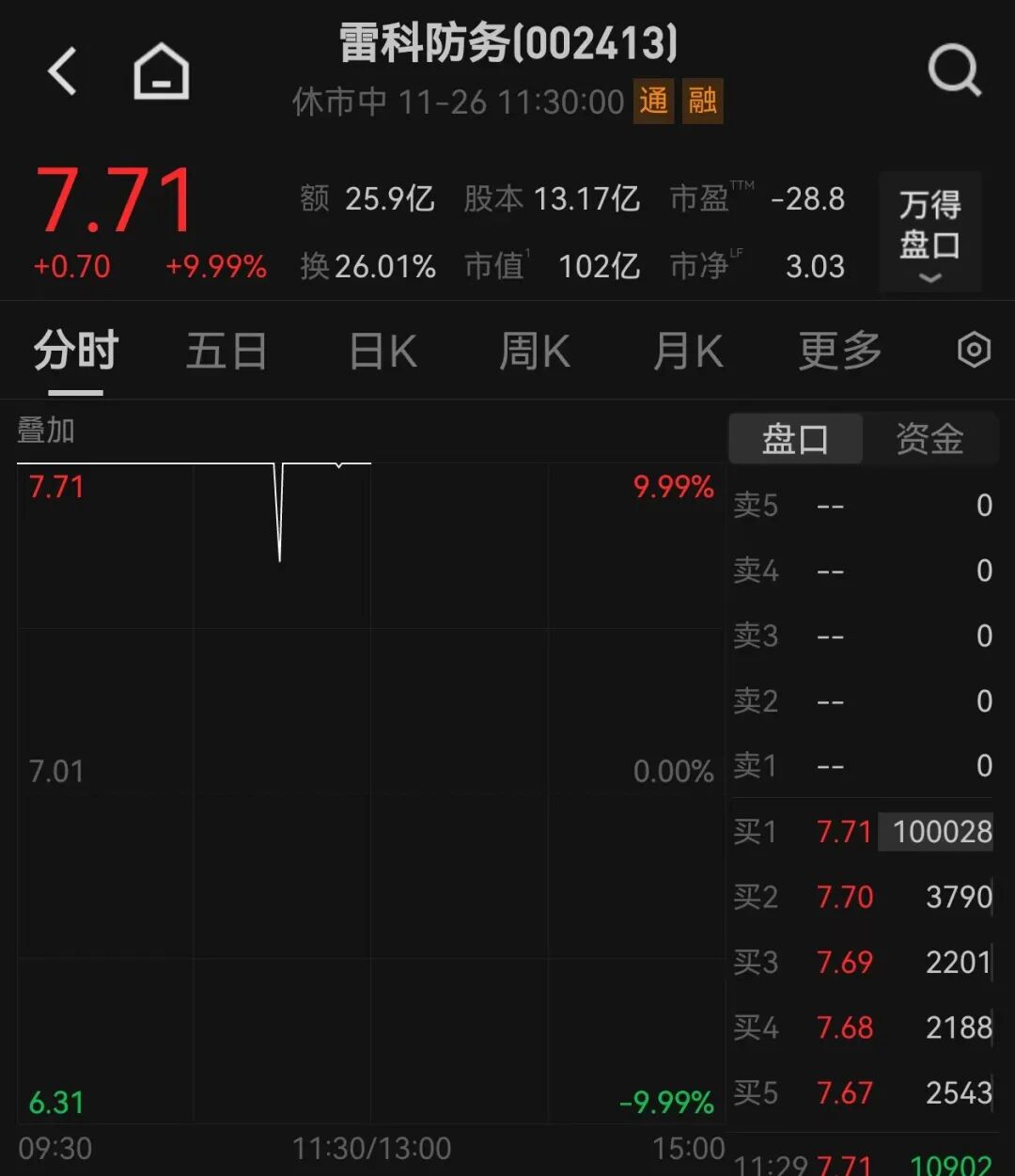 11月24日,此前已横盘两个月的雷科防务突然爆发,竞价交易后7分钟左右时间即封死涨停板。11月25日,该股开盘涨停,全天收T字型涨停。