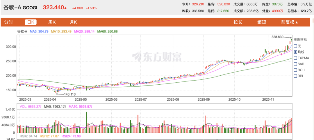 “一觉醒来,谷歌股价已经超过320了。”一位AI行业人士感慨。近一周以来谷歌市值屡创历史新高,11月26日,谷歌再次涨逾1.5%,收于323.4美元/股,市值超过3.9万亿美元,目前位列美股市值第三。近一个月以来谷歌涨幅已超过20%。