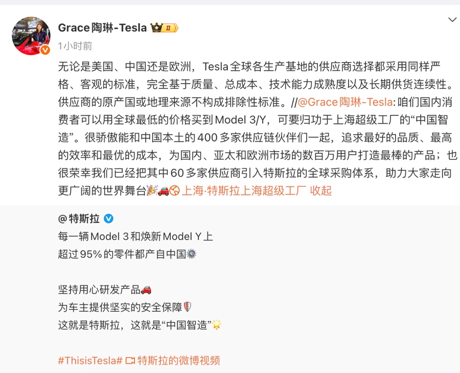值得注意的是,陶琳在回应中特别以上海超级工厂为例,阐释了中国供应链对特斯拉全球战略的重要价值。她表示,特斯拉在中国市场的性价比要归功于特斯拉上海超级工厂的“中国智造”,特斯拉很骄傲能和中国本土的400多家供应链伙伴们一起,追求最好的品质、最高的效率和最优的成本,为中国、亚太和欧洲市场的数百万用户打造最棒的产品。“也很荣幸我们已经把其中60多家供应商引入特斯拉的全球采购体系。”