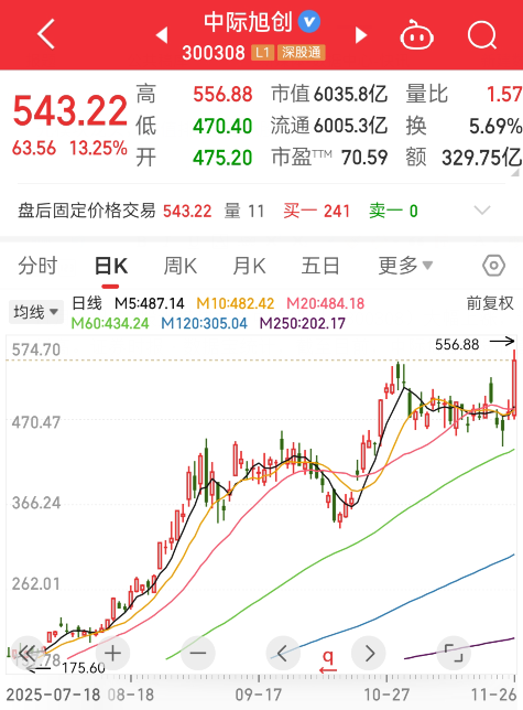 人民财讯11月26日电,11月26日,A股光模块龙头中际旭创(300308)大幅上涨,该股盘中一度涨超16%,收盘涨幅回落至13.25%,最新收盘价创历史新高。证券时报·数据宝统计,截至目前,中际旭创A股市值飙升至6035.82亿元,排名上升至A股第13位。