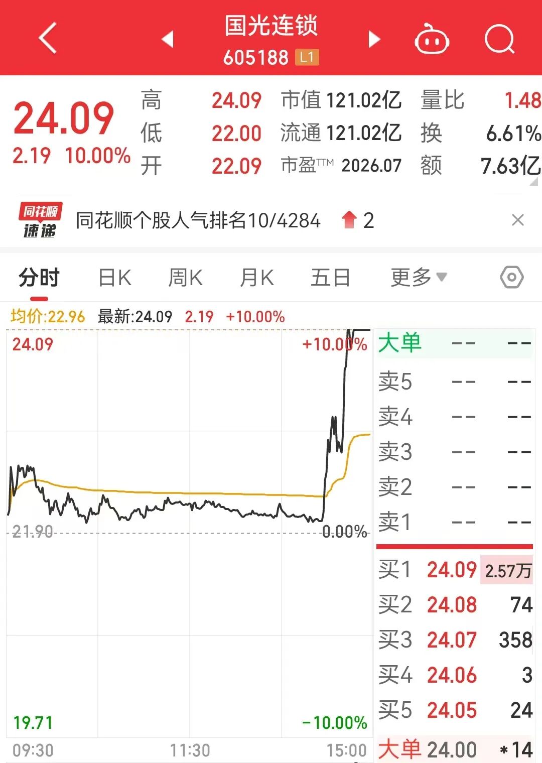 国光连锁在约14时27分开始拉升,由涨幅不到1%瞬间拉升至5%以上,并在14时48分封住涨停板,收盘时涨停板封单为2.57万手。