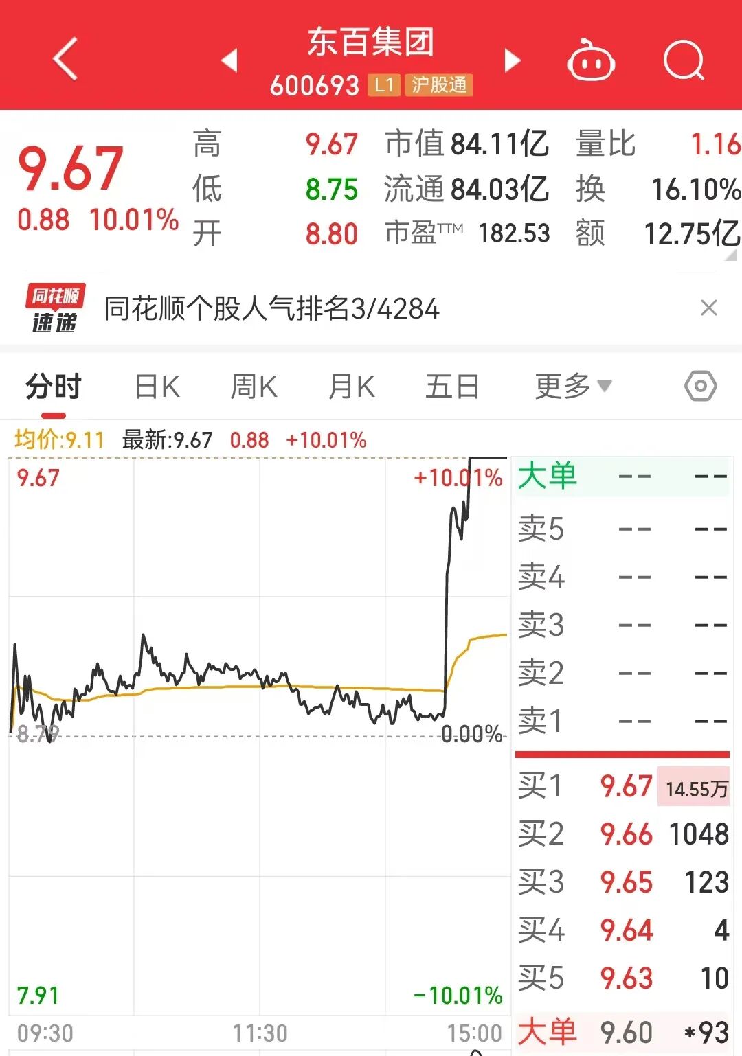11月26日,临近尾盘阶段,商业连锁板块多股出现大幅拉升。东百集团(600693)在14时29分左右大幅上涨,股价涨幅由不到1%瞬间拉升至8%以上,并在14时41分封住涨停板,收盘时涨停板封单达14.55万手。