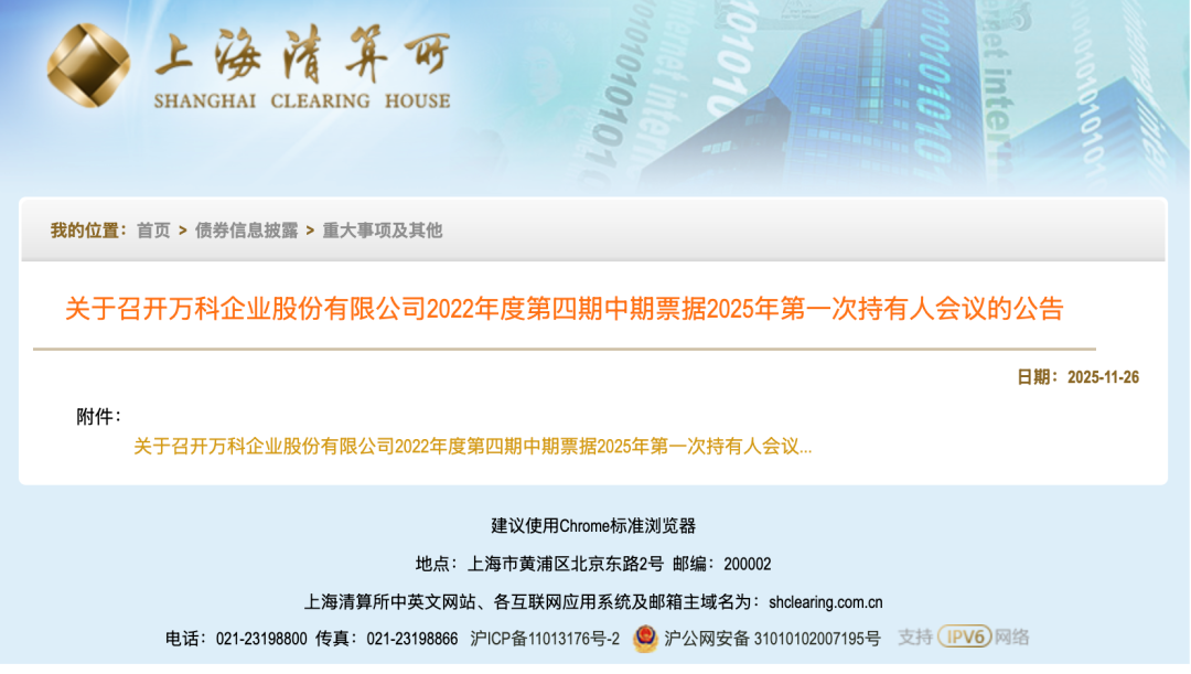 11月26日晚,万科在上清所发布公告称,将召开债权人会议讨论“22万科MTN004”的展期事项。