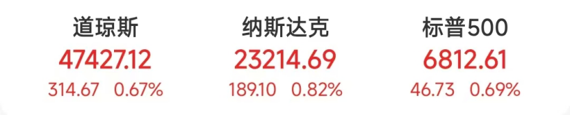 当地时间11月26日,美股三大指数收高。道指涨314.67点,涨幅为0.67%,报47427.12点;纳指涨189.10点,涨幅为0.82%,报23214.69点;标普500指数涨46.73点,涨幅为0.69%,报6812.61点。
