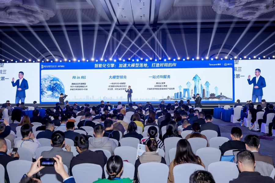 (腾讯全球数字生态大会无锡峰会期间,腾讯集团副总裁、政企业务总裁李强主题进行演讲。图片来源:腾讯)