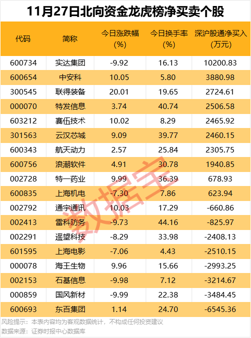 今日龙虎榜现身个股中,10股获北向资金净买入。净买入居首的是实达集团,金额为1.02亿元;中安科、联得装备等个股获净买入均超2000万元。