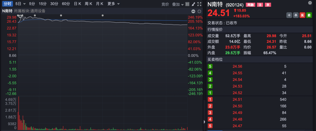11月27日,南特科技(920124)正式在北交所挂牌上市。公司以8.66元/股的发行价登陆资本市场,上市首日大涨183.03%,报收24.51元/股,全天成交额达13.96亿元,换手率68.63%,总市值为36.45亿元。
