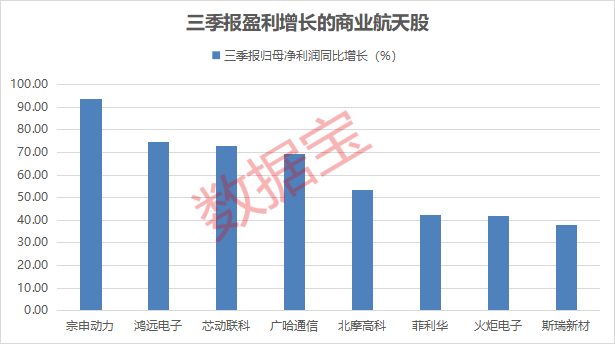 据证券时报·数据宝统计,A股中布局商业航天产业链的个股达63只,业绩上来看,今年前三季度10股扭亏为盈,5股减亏,13股归母净利润同比增长,整体报喜比例约为45%。归母净利润同比增长的个股中,宗申动力、鸿远电子、芯动联科增幅居前,分别为93.7%、74.56%、72.91%。