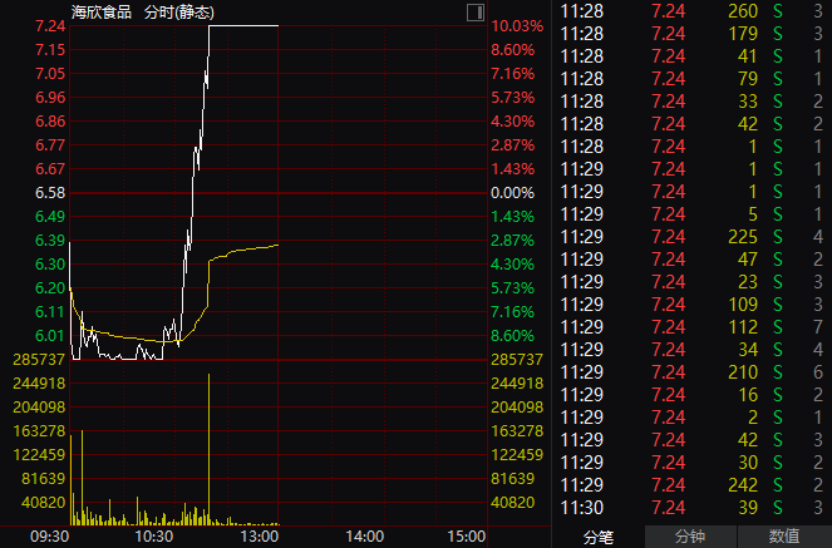 活跃个股方面,海欣食品上午股价剧烈波动,开盘后不久触及跌停,不过在上午10点半之后股价快速拉升,并很快涨停,上演“地天板”走势。此前于11月25日至11月27日期间,海欣食品曾连续3个交易日盘中触及涨停,其中,11月26日、27日两天收盘连续涨停。
