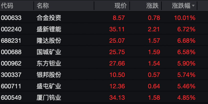 主要行业板块和赛道方面,若按照申万一级行业划分,有色金属板块领涨,板块盘中涨幅一度接近2%,后有所收窄,其中的多只锂矿概念股涨幅居前。合金投资涨停,盛新锂能、隆达股份、国城矿业、东方钽业、银邦股份等多股涨幅超过5%。