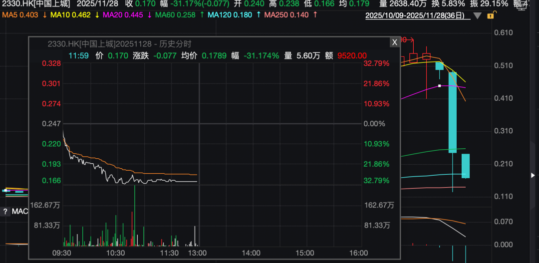 港股市场大幅波动的个股中,中国上城继续暴跌,盘中跌幅超过30%。值得注意的是,行情数据显示,此前一个交易日中国上城股价闪崩,盘中跌幅一度超过70%,截至当天收盘仍大跌超过50%。