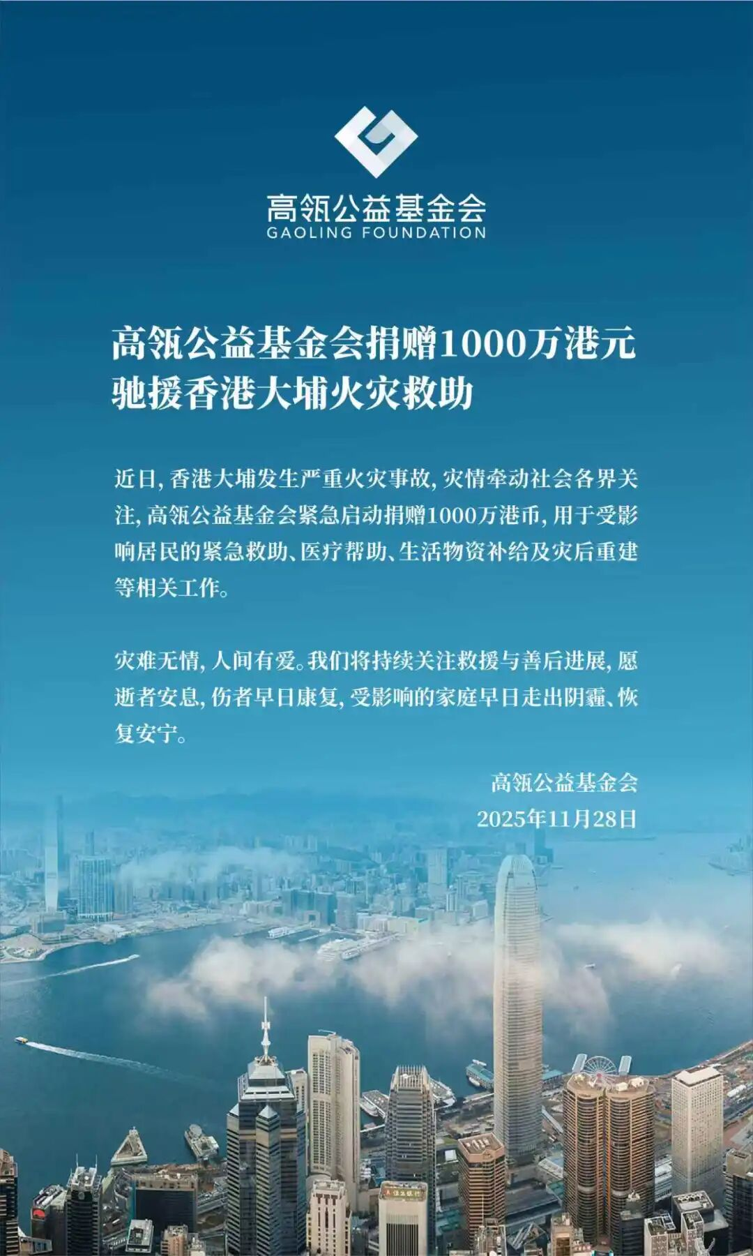高瓴紧随其后。11月28日中午,高瓴公益基金会宣布捐赠1000万港元,驰援香港大埔火灾救助,用于受影响居民的紧急救助、医疗帮助、生活物资补给及灾后重建等相关工作。高瓴公益基金会表示,将持续关注救援与灾后进展。
