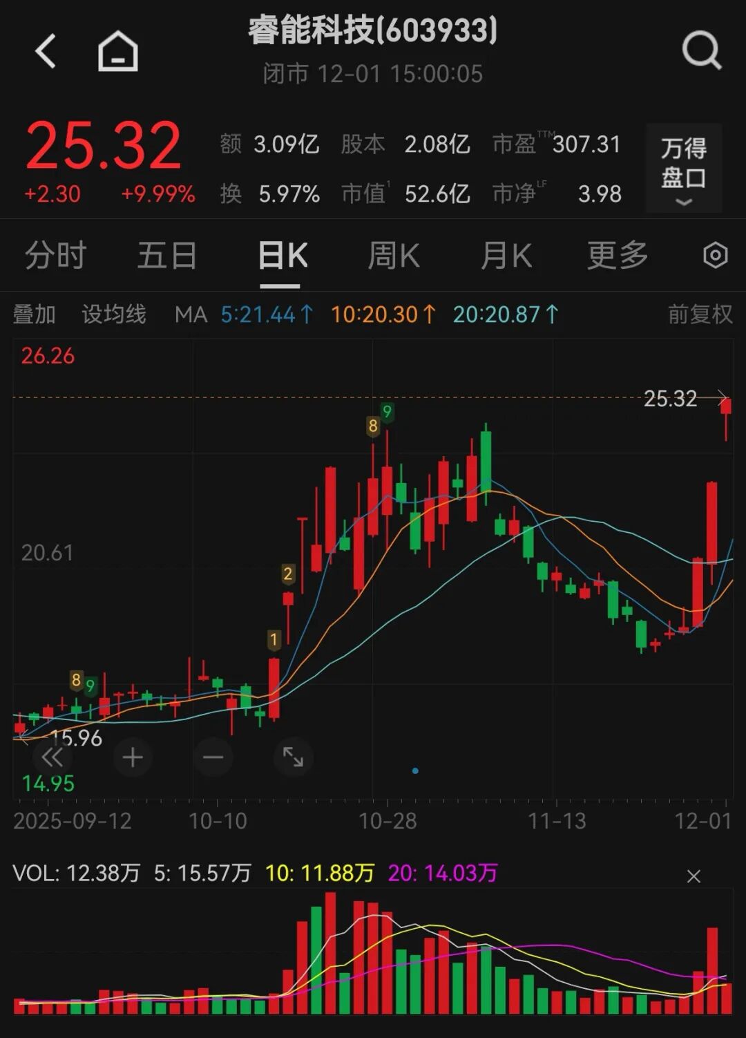 12月1日,睿能科技(603933)继续以涨停收盘,收获3连板,最新报收25.32元/股,市值近53亿元。