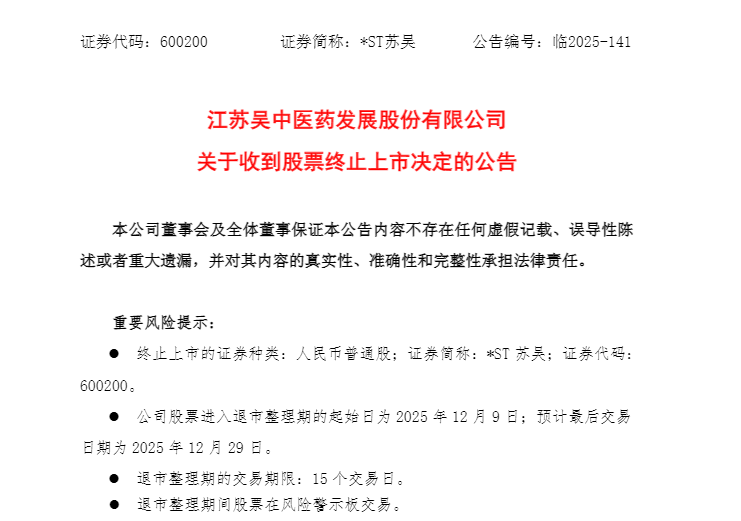 12月1日晚间,*ST苏吴(600200)发布公告称,公司当日收到上交所出具的《关于江苏吴中医药发展股份有限公司股票终止上市的决定》,上交所决定终止公司股票上市。