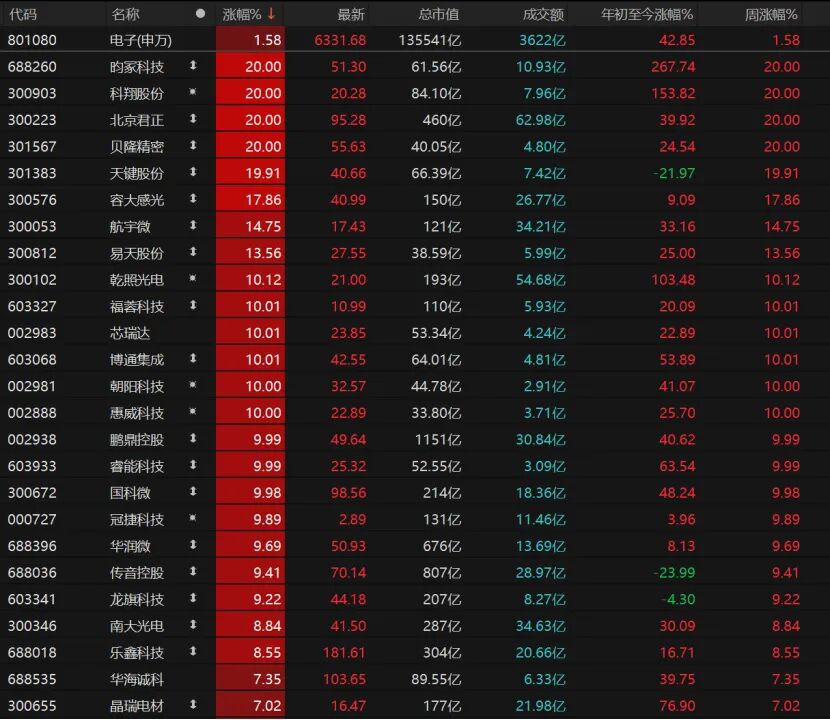 12只电子股涨停,昀冢科技、科翔股份、北京君正、贝隆精密、天键股份“20cm”涨停,福蓉科技、芯瑞达、博通集成、朝阳科技、惠威科技、鹏鼎控股、睿能科技涨停。