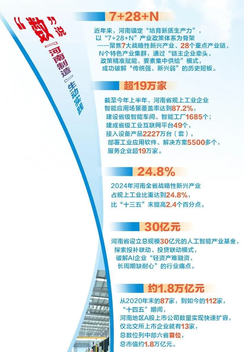 企业实践印证全省成效。截至今年上半年,河南省规上工业企业智能应用场景覆盖率达87.2%,建设省级智能车间、智能工厂1685个;建成省级工业互联网平台49个,接入设备产品2227万台(套),部署工业应用软件、解决方案5500多个,服务企业超19万家。曾支撑国家工业化的“老基地”,如今以数字化新面貌,继续担当先进制造业的“压舱石”。