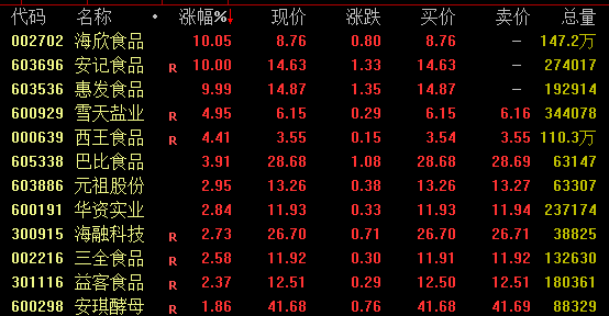 食品饮料板块午后发力拉升,截至收盘,海欣食品、安记食品、惠发食品涨停,雪天盐业涨近5%,西王食品、巴比食品涨约4%。