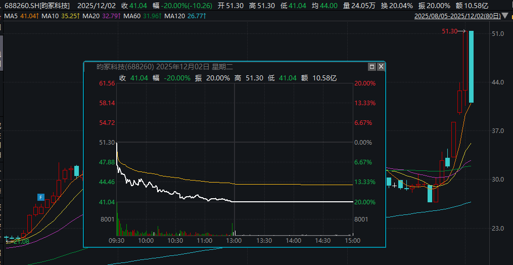 昀冢科技(688260)盘中大幅跳水,午后跌停。截至收盘,该股报41.04元/股,全日成交超10亿元。此前6个交易日,该股已累计大涨超90%。