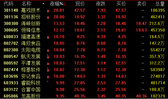 两岸融合强势集体飙升,截至收盘,嘉戎技术、招标股份20%涨停,海峡创新涨超13%,福建高速、平潭发展、合富中国等亦涨停。