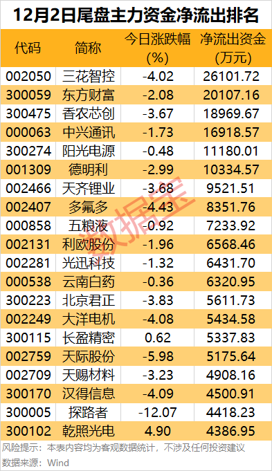 据数据宝统计,16股尾盘主力资金净流出金额均超5000万元,其中6股尾盘净流出均超1亿元。三花智控和东方财富尾盘主力资金净流出均超2亿元,居前。