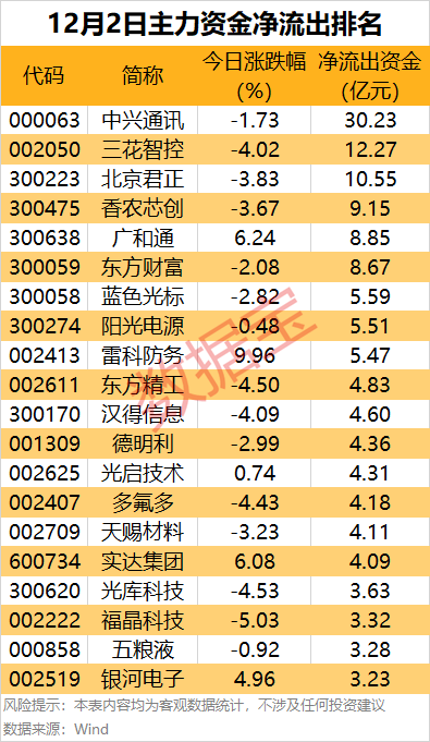 3股主力资金净流出金额逾10亿元,其中通信龙头股中兴通讯主力资金净流出30.23亿元,居首,净流出额创2020年3月16日以来新高。
