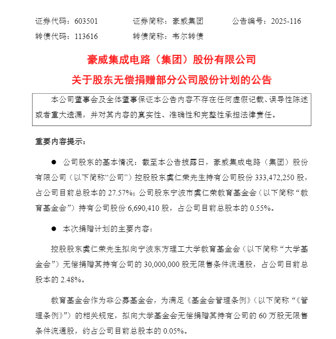 12月2日晚间,豪威集团(603501)公告称,为支持教育事业发展,资助大学基金会开展慈善公益活动,并支持宁波东方理工大学办学发展所需的教学、科研、师资等资源配置,控股股东虞仁荣拟向宁波东方理工大学教育基金会(以下简称“大学基金会”)无偿捐赠其持有公司的3000万股无限售条件流通股,占公司目前总股本的2.48%。