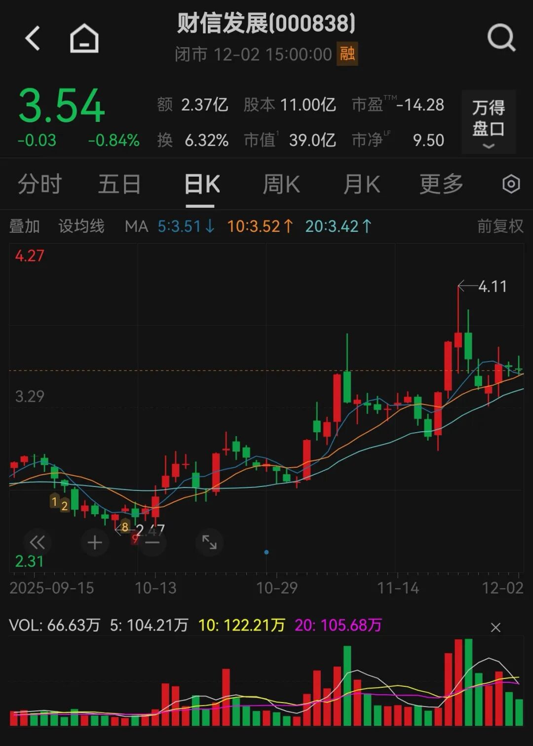 公告同时提示,此次股份收购尚需履行相关内部决策及监管审批程序,最终能否达成存在不确定性。财信发展表示,将根据交易进展及时履行信息披露义务。截至12月2日收盘,财信发展股价报3.54元/股,总市值38.96亿元。