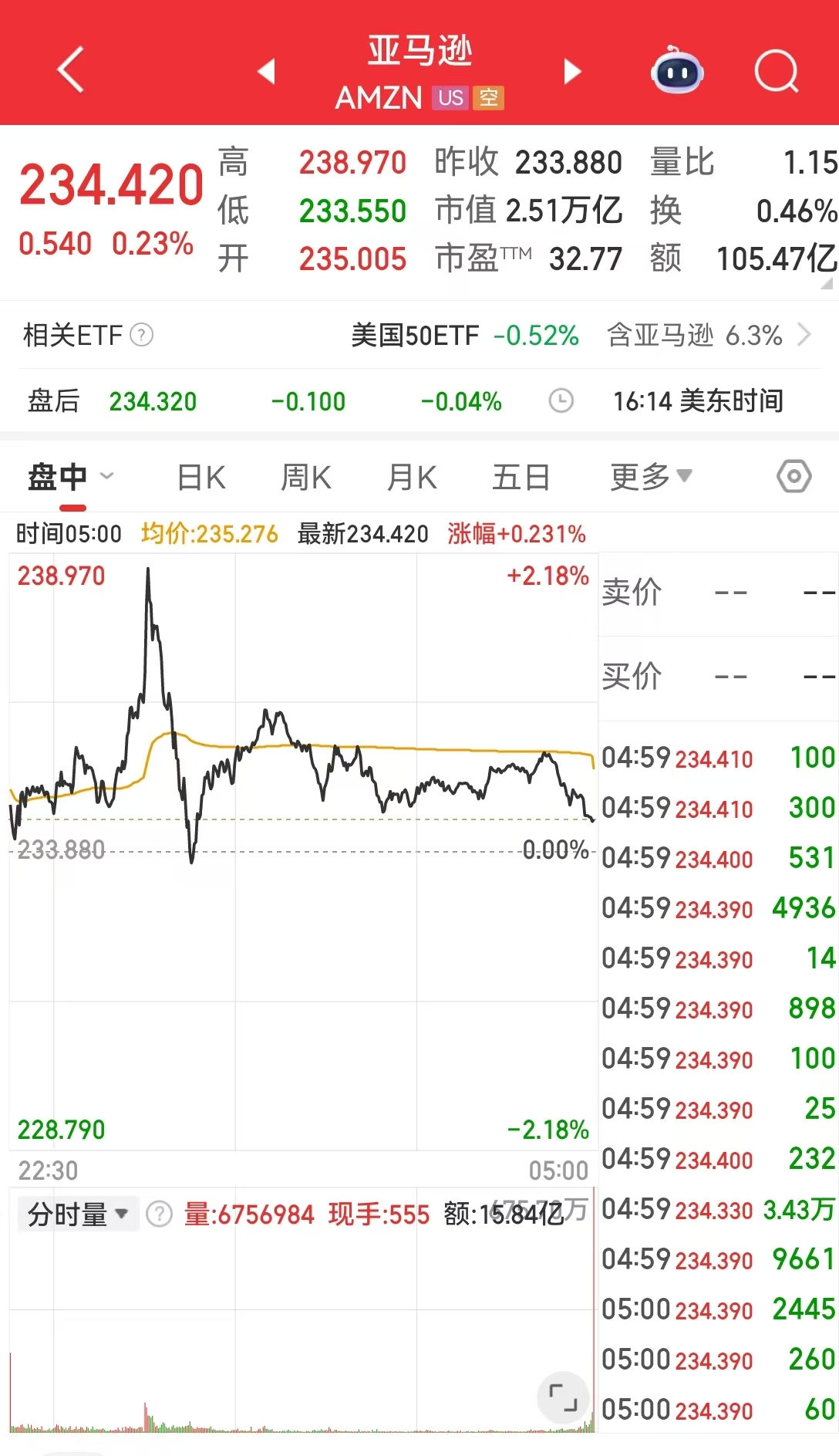 新AI芯片的消息公布后,亚马逊股价盘中一度涨超2%,截至收盘报234.42美元,涨幅0.23%,市值2.51万亿美元。