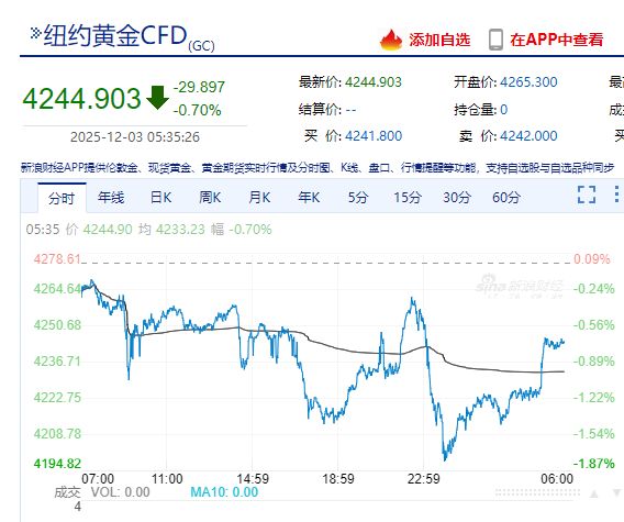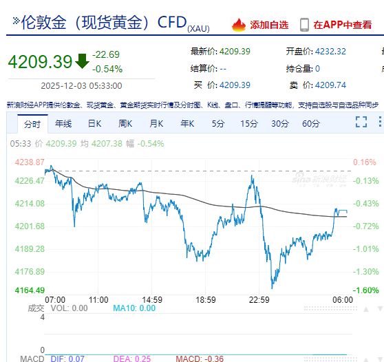 现货黄金收跌0.54%,报4209.39美元/盎司。纽约黄金跌0.70%。