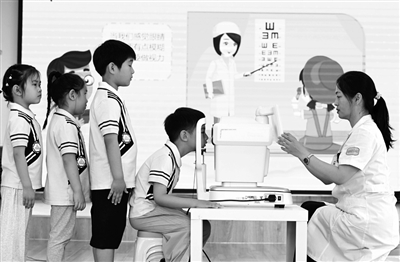 在河北省石家庄市新华区柏林幼儿园,社区医护人员为小朋友做视力检查。资料图片