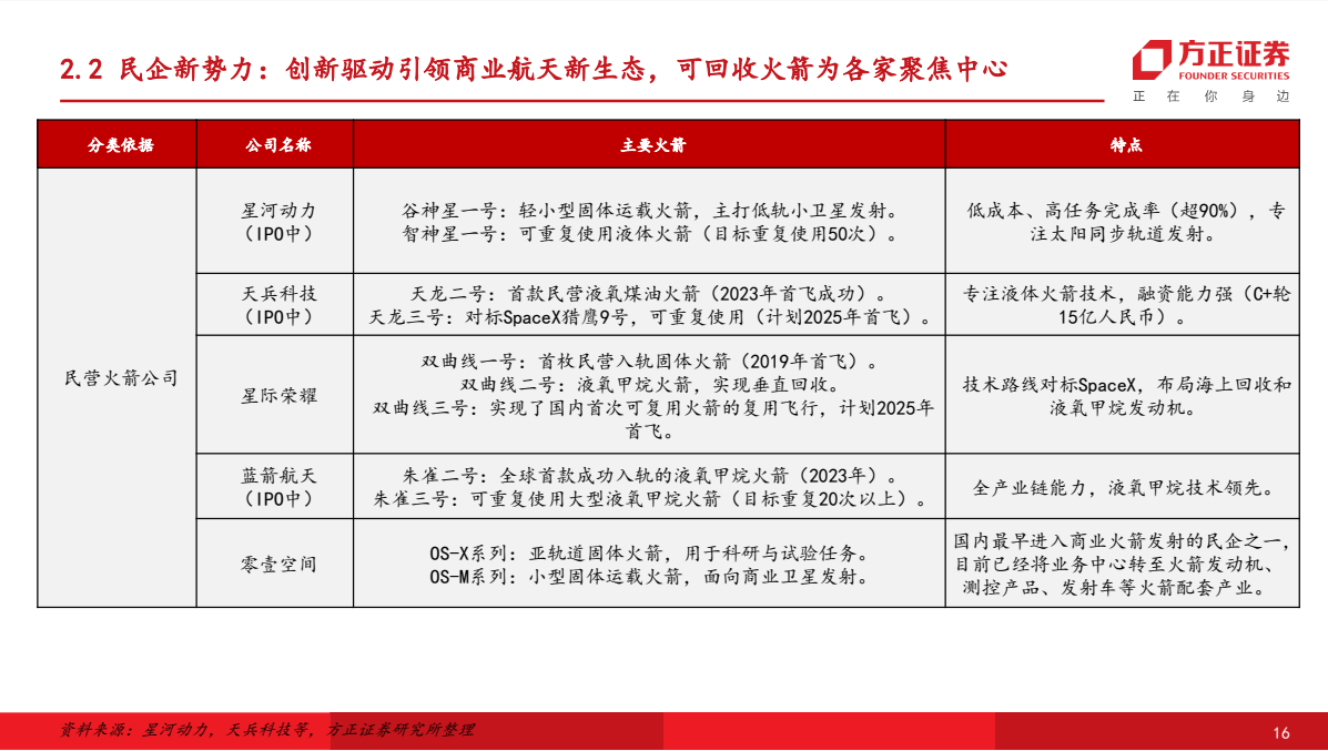 据方正证券统计,除蓝箭航天外,目前星河动力的智神星一号、天兵科技的天龙三号、星际荣耀的双曲线三号,东方空间的引力二号、三号,深蓝航天的星云一号、二号,中科宇航的力箭三号都将可回收视作重要目标。其中,力箭三号目标是重复100次,引力三号目标是全箭回收。
